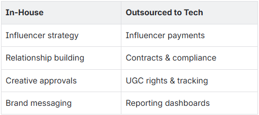 - Self-serve portals for influencers with briefs, uploads, and feedback loops